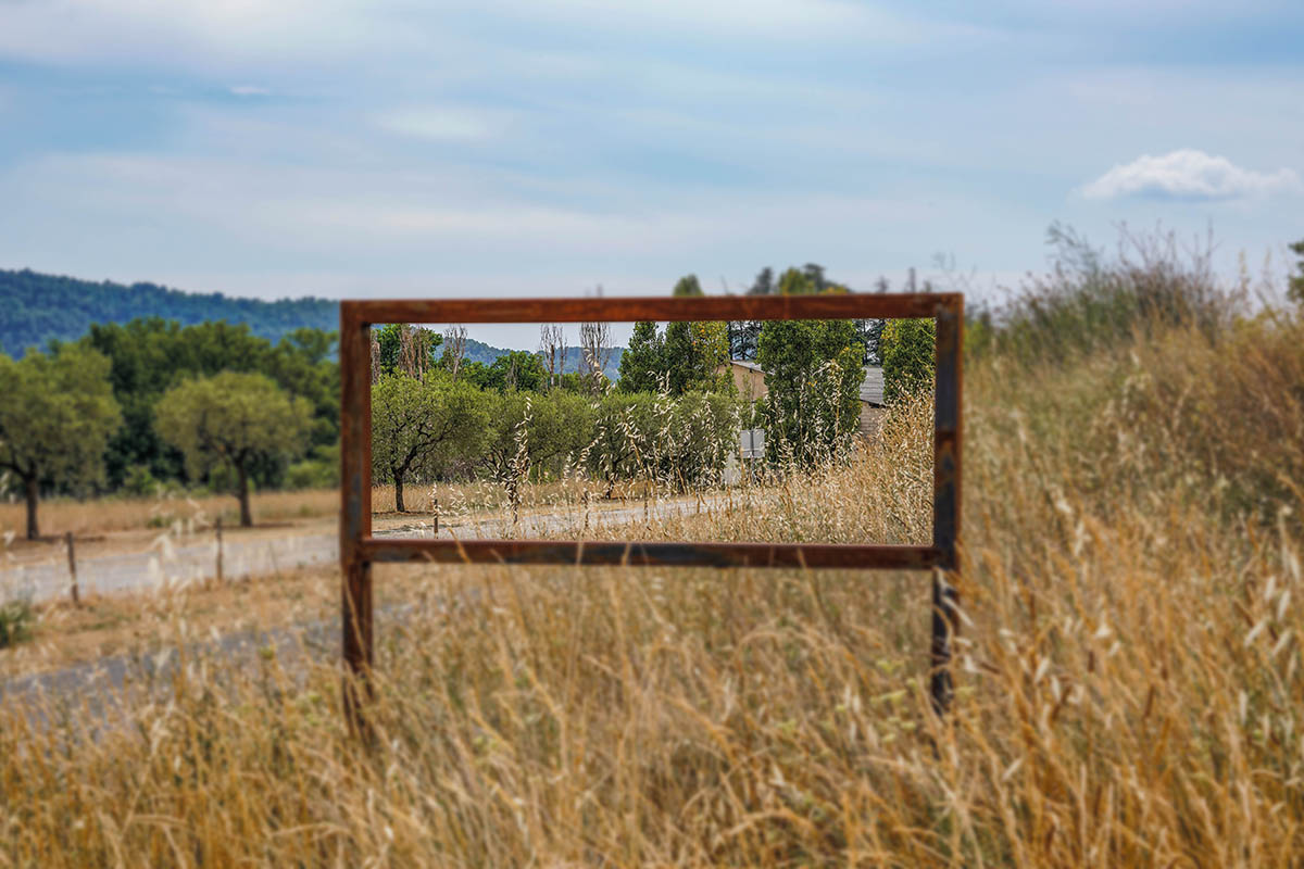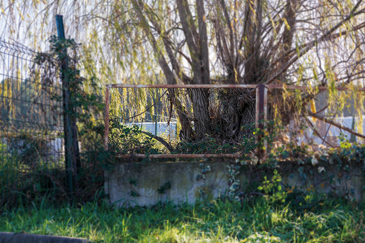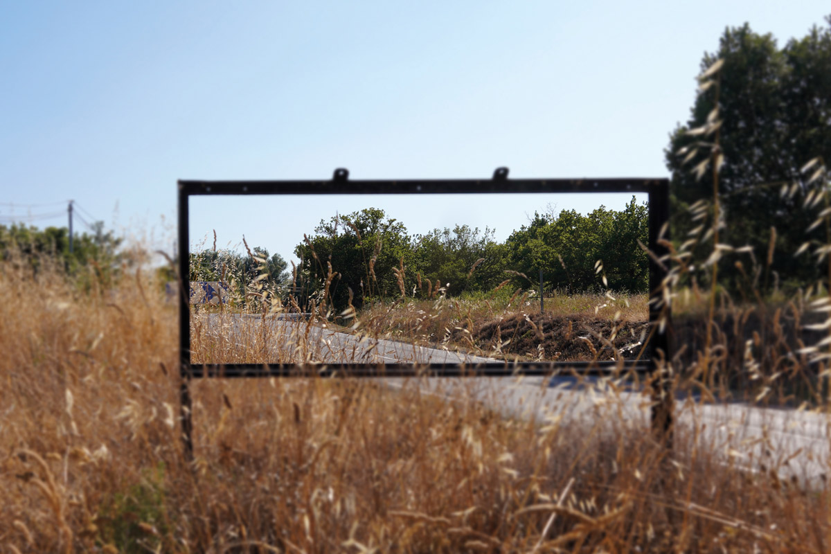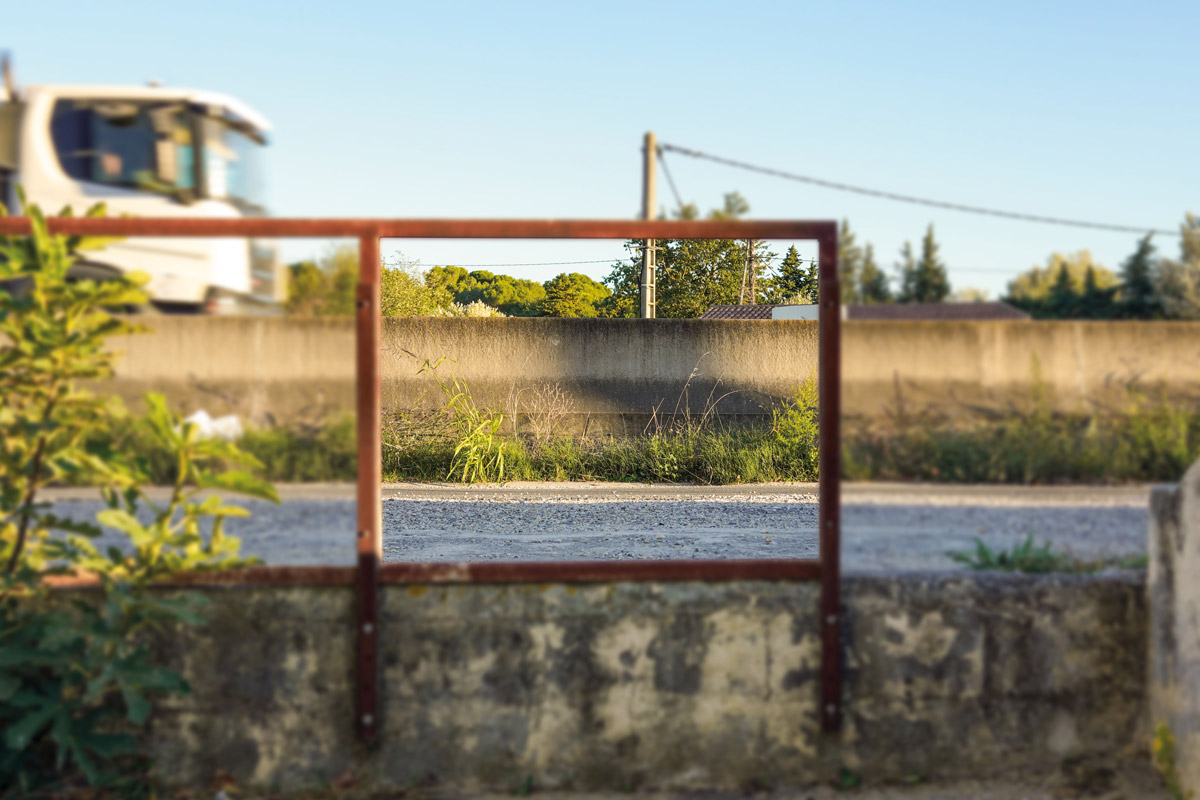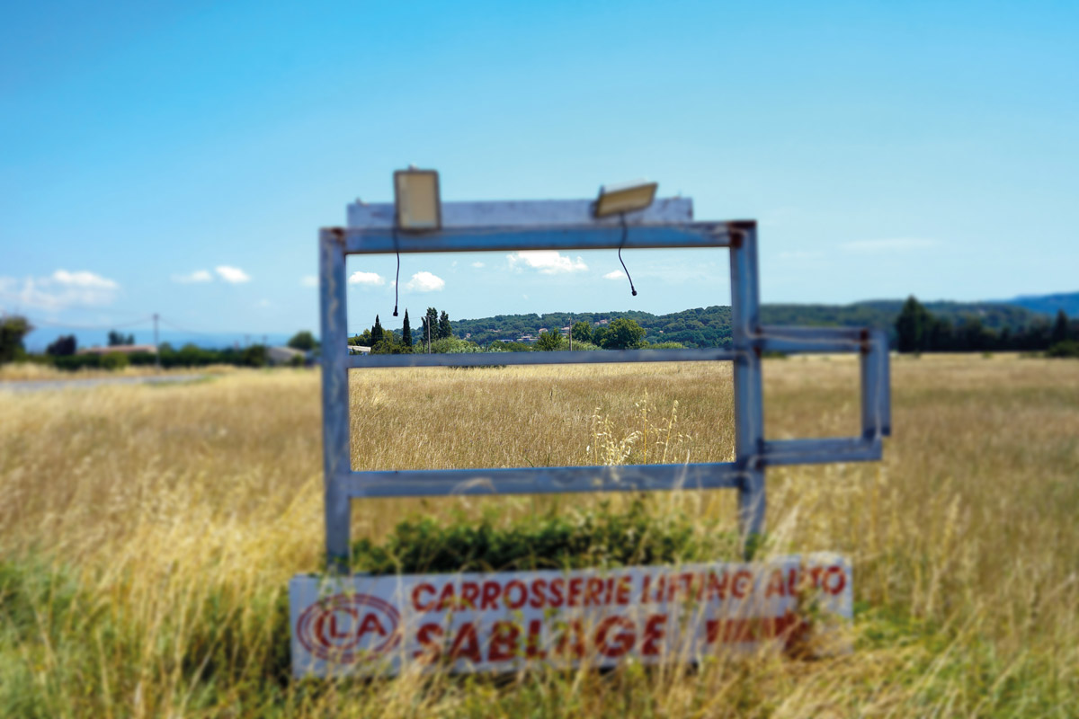 Each photograph corresponds to an empty frame found within the landscape. This frame might be an old, emptied display stand, the skeleton of a sign, a permanent or temporary structure, and so on. This frame thus defines a composition for the artist, leaving very little room for their subjectivity, choices, or decisions—in short, everything that underlies an artistic gesture. However, there are micro-spaces of freedom at the margins, and it is precisely within these that the artist works.