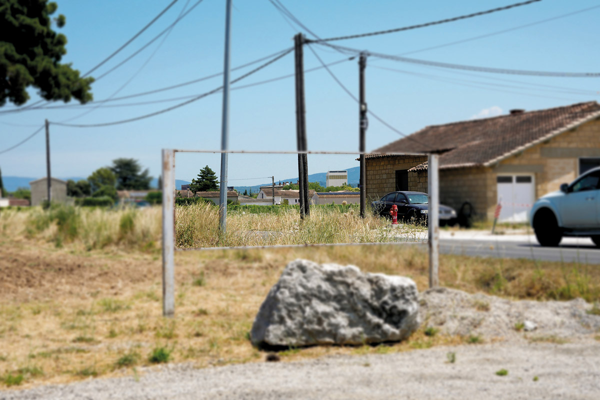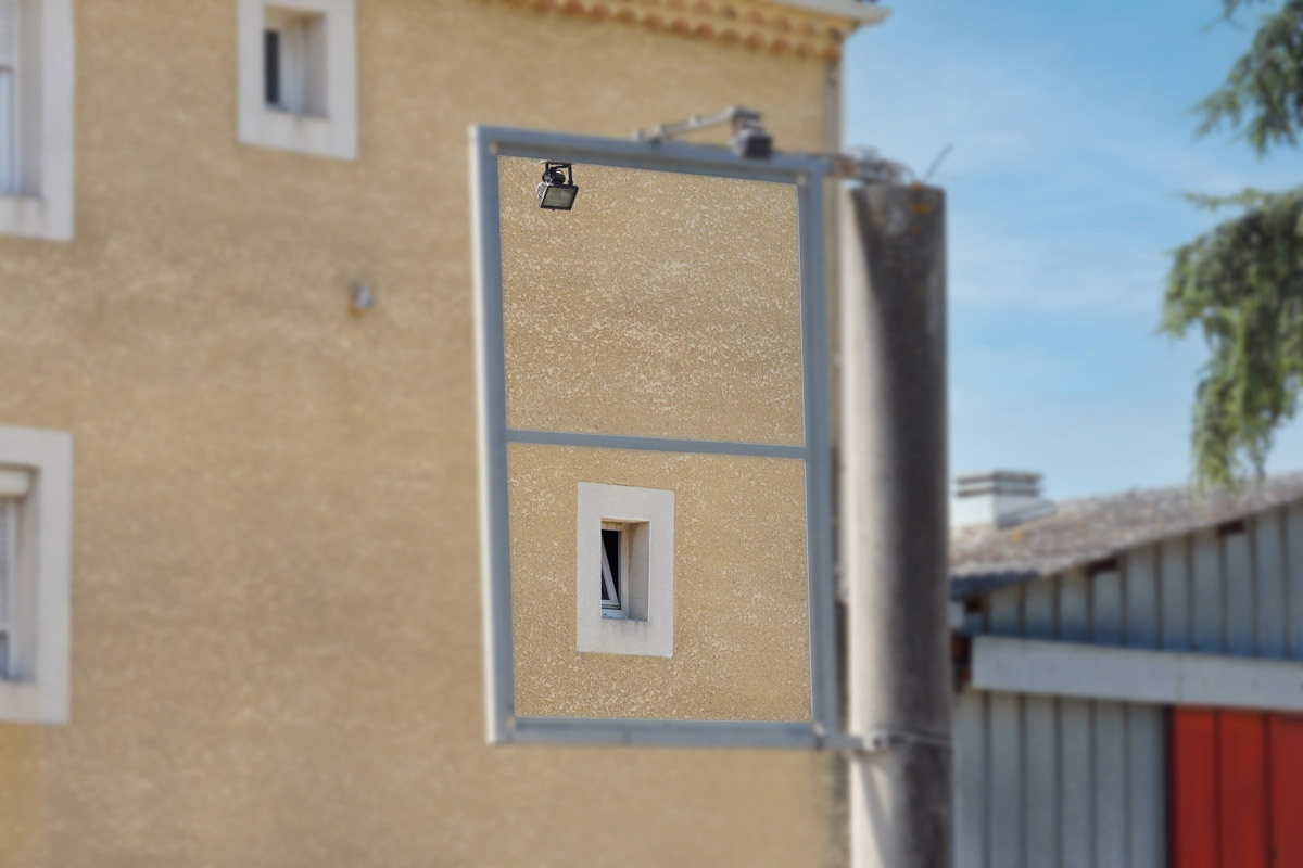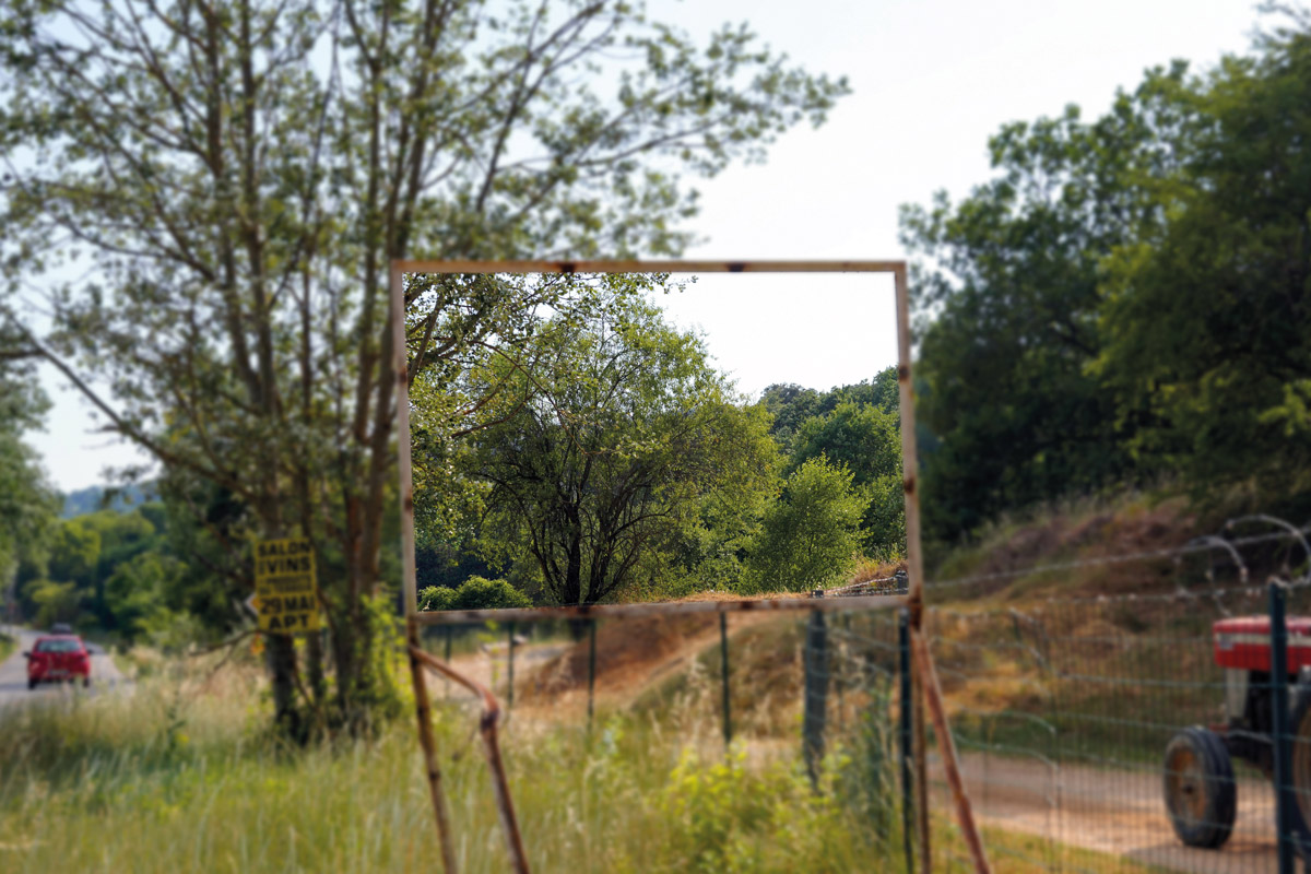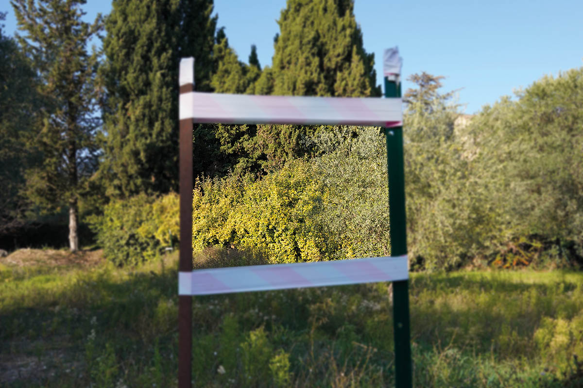 Each photograph corresponds to an empty frame found within the landscape. This frame might be an old, emptied display stand, the skeleton of a sign, a permanent or temporary structure, and so on. This frame thus defines a composition for the artist, leaving very little room for their subjectivity, choices, or decisions—in short, everything that underlies an artistic gesture. However, there are micro-spaces of freedom at the margins, and it is precisely within these that the artist works.